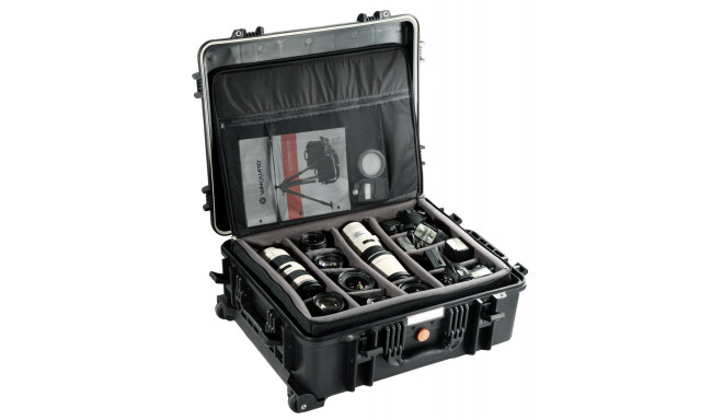 Водонепроницаемость (до глубины 5 метров) и герметичность Для размещения оборудования внутри кейса используется мягкий съемный чехол с регулируемыми перегородками Армированные сталью ушки для навесных замков Встроенные колесики и выдвигающаяся ручка