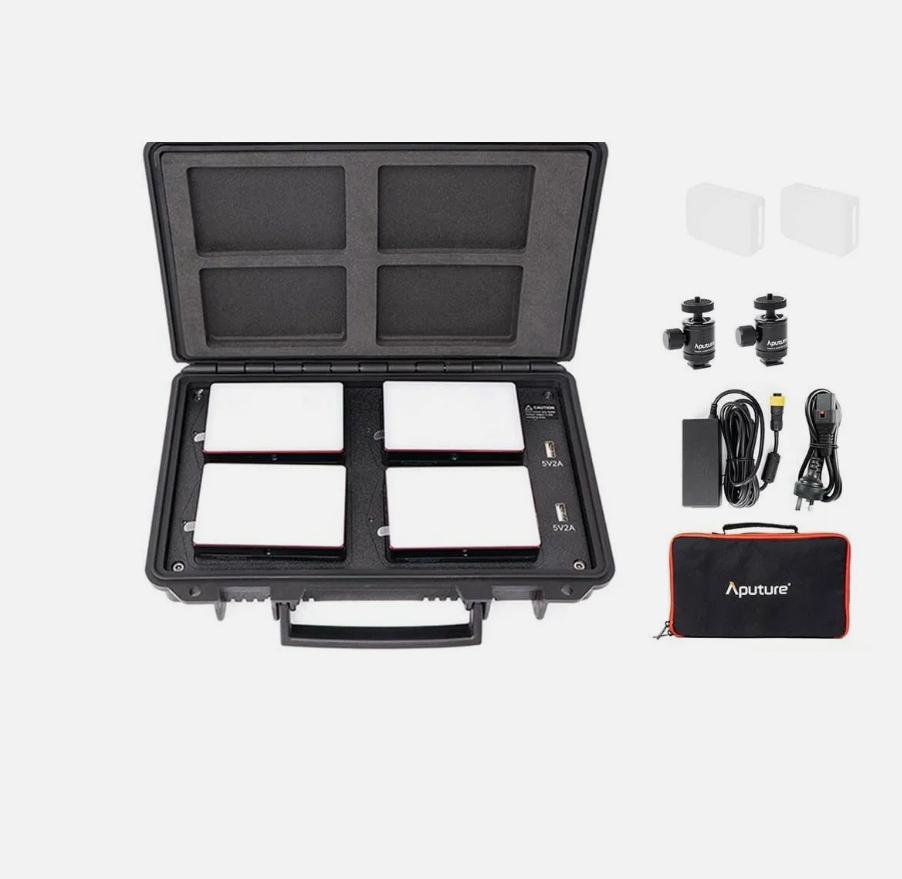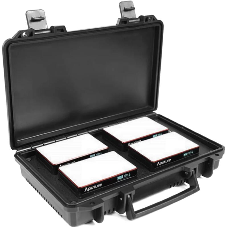 Aputure MC 4-Light Travel Kit – комплект из 4 компактных RGBWW светодиодных панелей Aputure MC. Кейс может одновременно заряжать всех 4 осветителя: используется беспроводная зарядка, от 0 до 100% за 3.5 часа. Если вам нужно быстрее, есть 2 USB порта 5В 2А, которые зарядят Aputure MC до 100% за 2 часа.