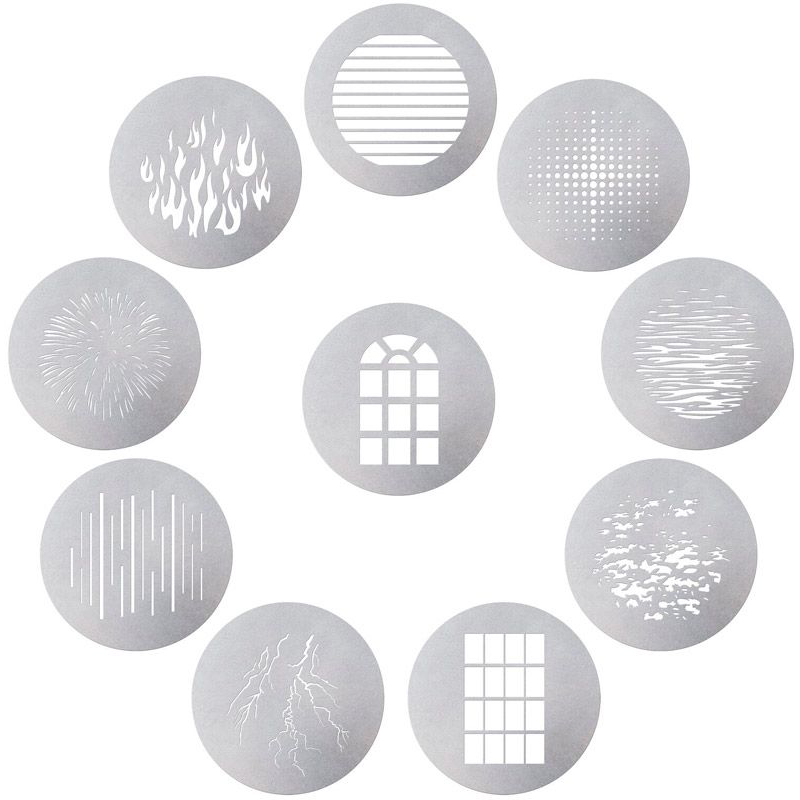 Набор из 10 насадок GOBO для модификаторов света Aputure Spotlight. Предназначены для создания различных свето-теневых рисунков. Размер дисков - "B" (диаметр - 8,6 см).